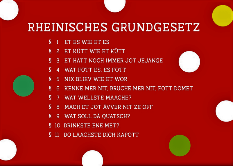 Auch Fische-Geborene fahren manchmal schneller als die Polizei erlaubt, klauen Handtücher aus Hotels und betrügen bei der Steuererklärung. So habe auch ich mehr als nur einmal mit einem Bein im Knast gestanden. In erster Linie war für mich persönlich in allen Lebenslagen das „Rheinische Grundgesetz“ maßgebend und lebensbestimmend. Es beinhaltet alles, was wir im Alltag und im praktischen Umgang mit anderen benötigen – Lebensweisheiten, die das Miteinander erleichtern und sich überall auf dieser Welt schon hunderttausendfach bewährt haben.